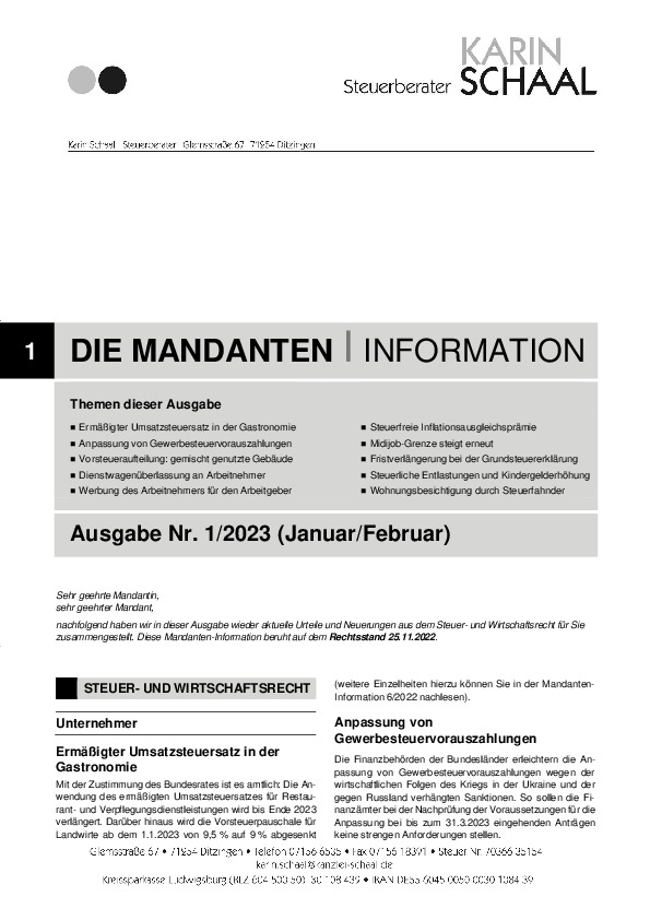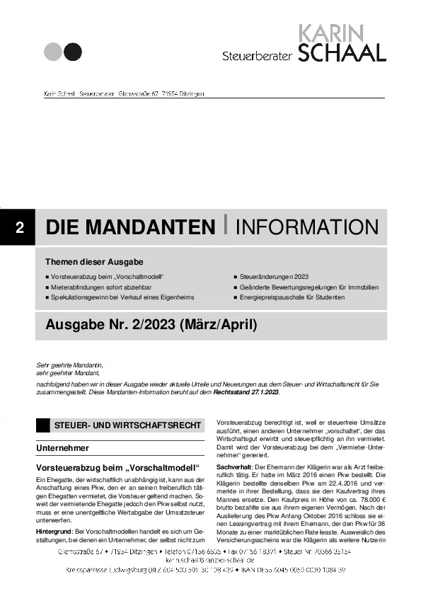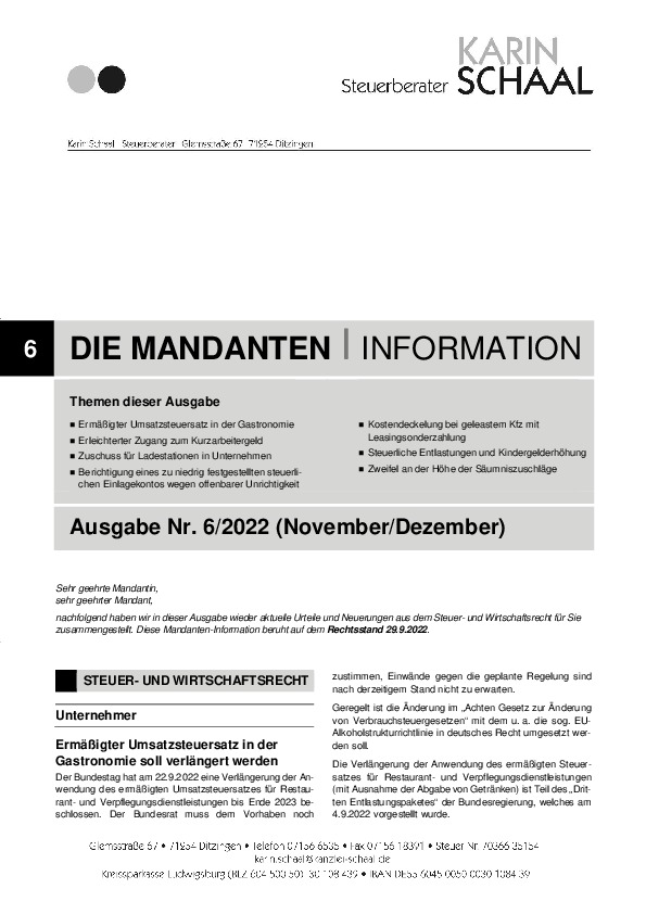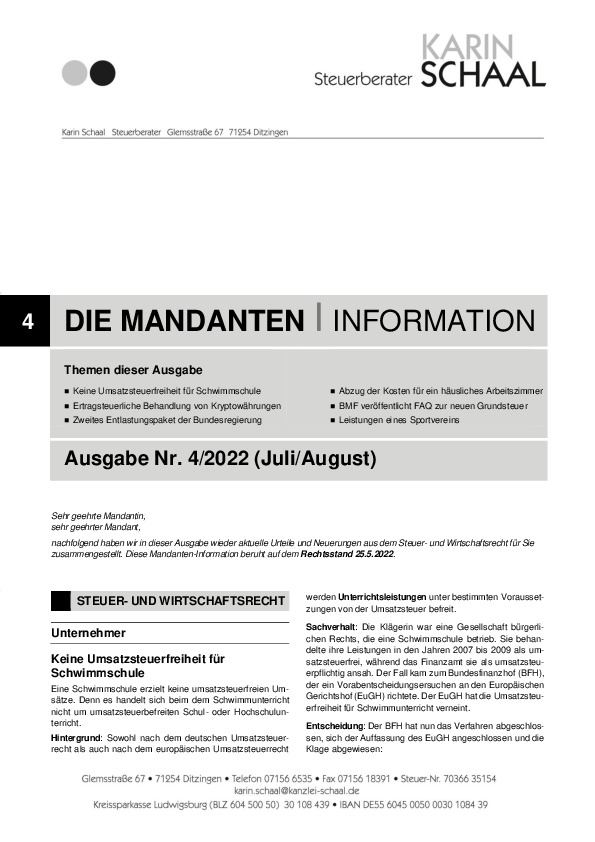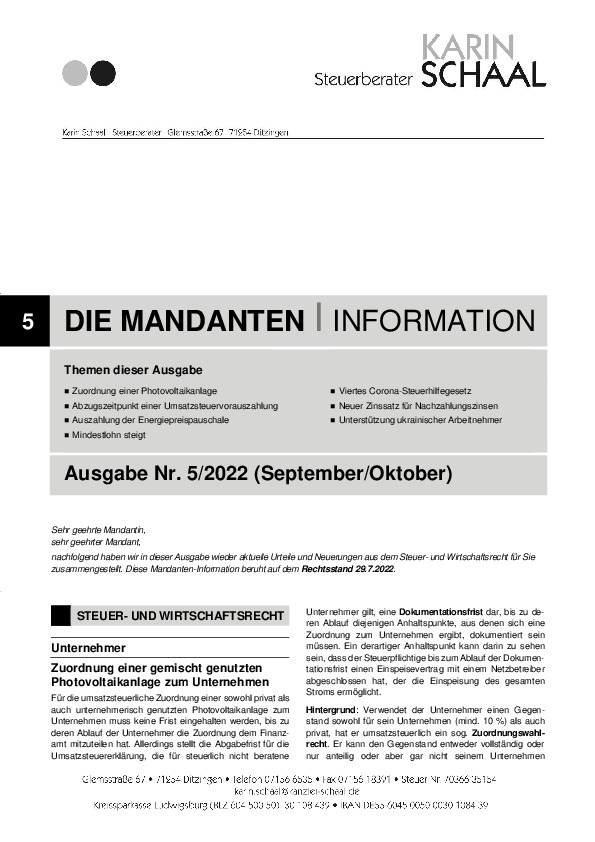 nachfolgend haben wir in dieser Ausgabe wieder aktuelle Urteile und Neuerungen aus dem Steuer- und Wirtschaftsrecht fuM6;r Sie zusammengestellt. Diese Mandanten-Information beruht auf dem Rechtsstand 25.5.2022.